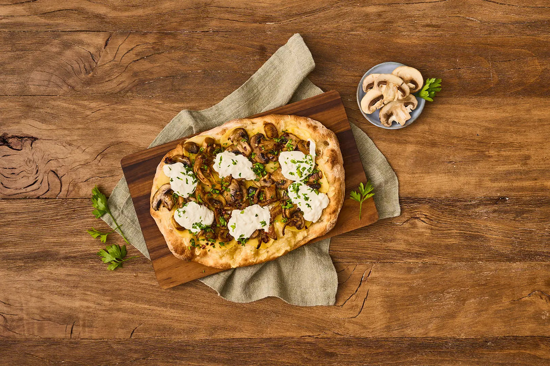 Pinsa Romana mit Fontina, Kartoffeln, Champignons, Burrata und Chili