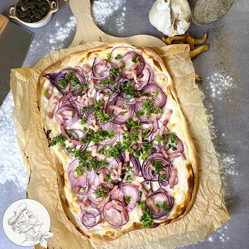 Entscheiden Sie sich für unseren Flammkuchenteig Weizen und erleben Sie, wie sich traditionelle Rezeptur und moderne Herstellungsverfahren zu einem unvergesslichen Backerlebnis vereinen – perfekt für alle, die authentische Flammkuchen lieben.