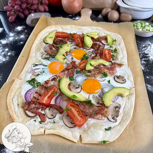 Herzhafter Flammkuchen mit Crème, Frühstücksspeck, Ei, Champignons, Avocado und Tomaten – perfekt für den Brunch!