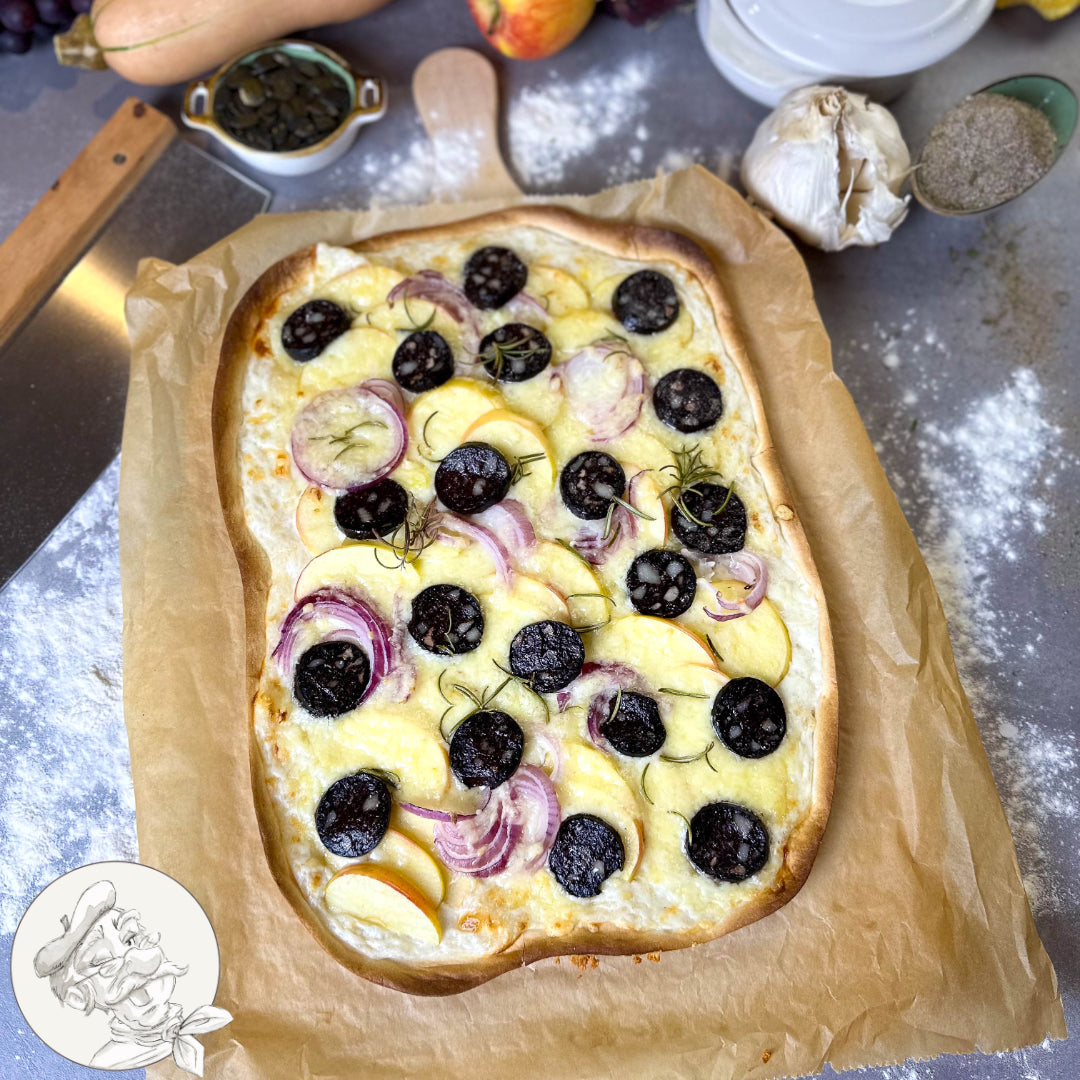 Herzhafter Flammkuchen mit Blutwurst, Apfel und Käse – eine besondere Geschmackskombination.